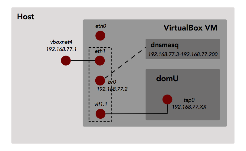The VirtualBox engine exposes the host-only interface to the host as vboxnet4 with a pre-configured IP (e.g. IP is set in Vagrantfile as part of definition of host-only network). This interface is linked to the eth1 "physical interface" inside the VM and part of the same ethernet network. We create a br0 interface which is a bridge: An interface that connects two or more interfaces by routing the packets to/from each of the bridged interfaces. In this case it connects the host-only interface (eth1) and the the virtual interfaces created for each domU kernel, in this case vif1.1. The latter is pair of a pair of virtual interfaces created by underlying hypervisor when the domU kernel boots up, the other member of the pair being the tap0 interface on the domU side. Each packet going through either interface is made available to the other interface.