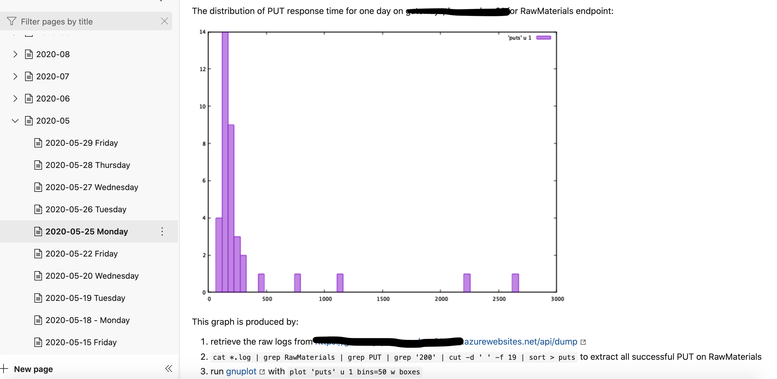 In this case, I was trying to understand why tests were slow and I graphed the distrbution of execution times for "writes" using some GNUPlot script. This picture also shows the tree of daily log entries, with daily pages "archived" under each month.